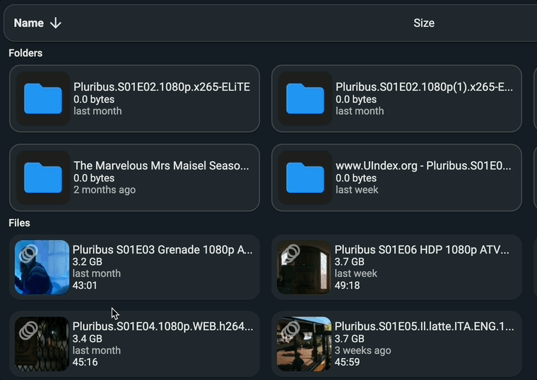 If the file is a video and “enable motion preview for videos” is enabled, it will also roll through snapshots of the video at different lengths. Notice the 3-circle icon overlay to indicate that the thumbnail has motion preview support.