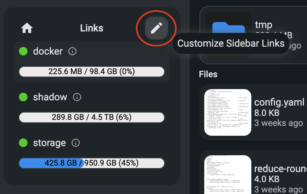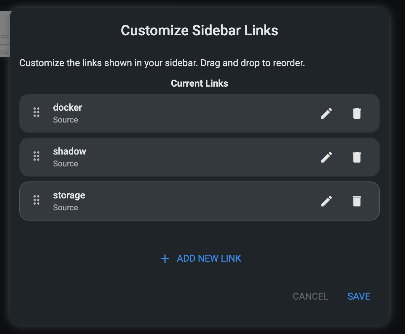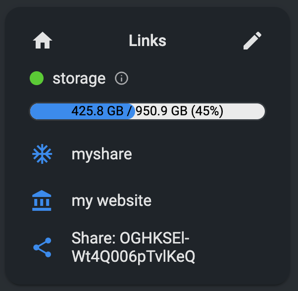 Custom links offer name, path, and icon support. This is a general purpose link that can act as a favorite/bookmark in the bar. Supporting external links as well as shares. A relative link is also possible, for example /public/share/OGHKSEl-Wt4Q006pTvlKeQ