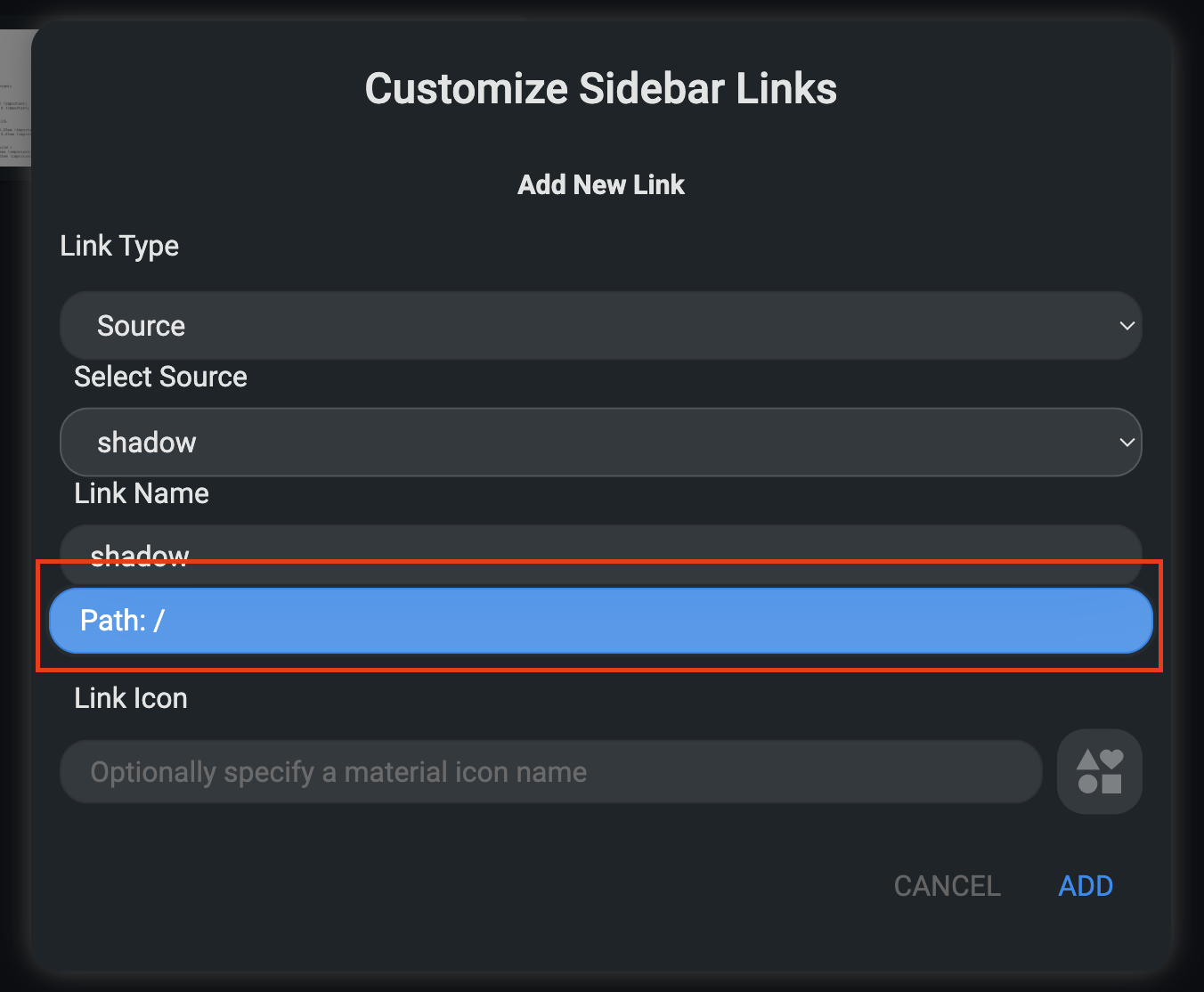 After selecting the desired source, you can configure the display name, a subpath, and an icon.
