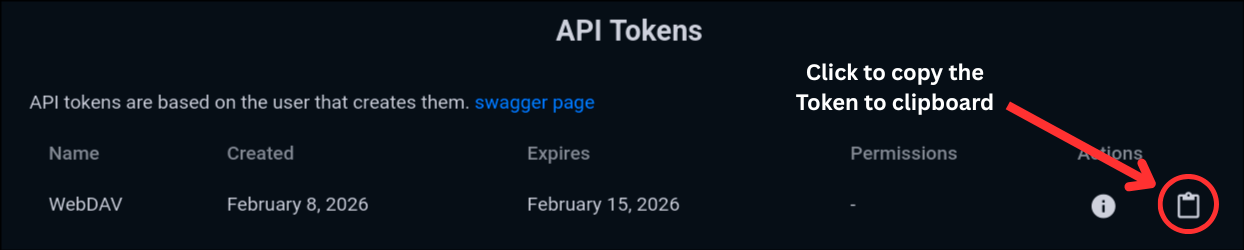Once you created the Token, copy it to your clipboard and use it as password for you preferred WebDAV client.